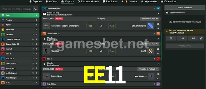 O EE11 oferece uma grande seleção de opções de apostas em e-sports com probabilidades competitivas